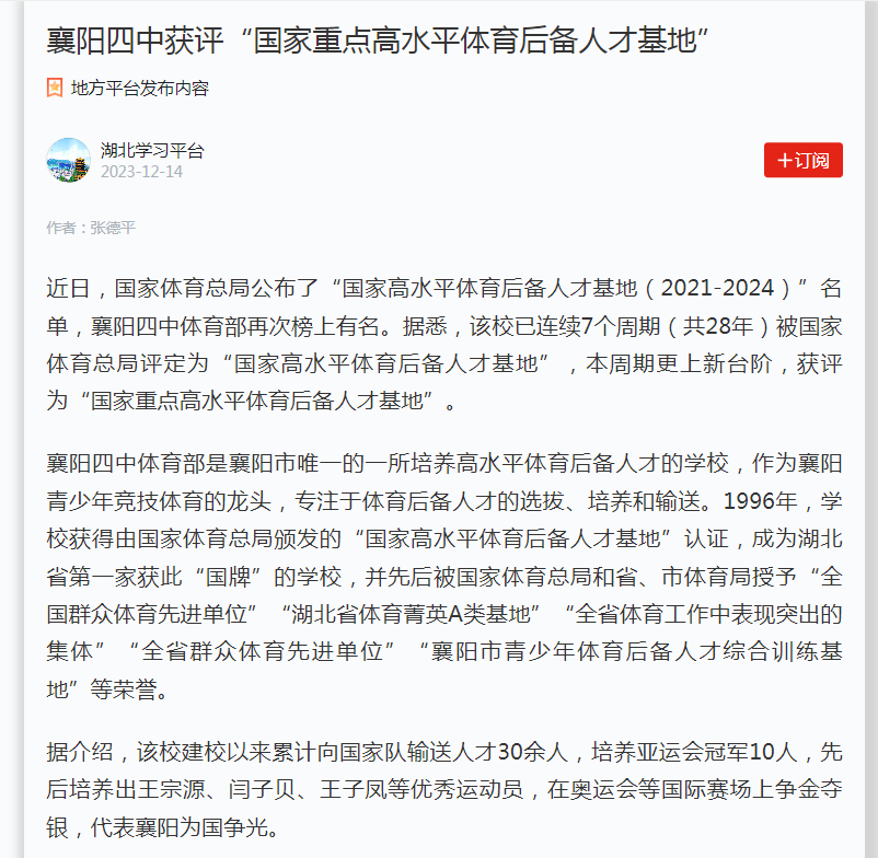 襄阳四中获评“国家重点高水平体育后备人才基地”